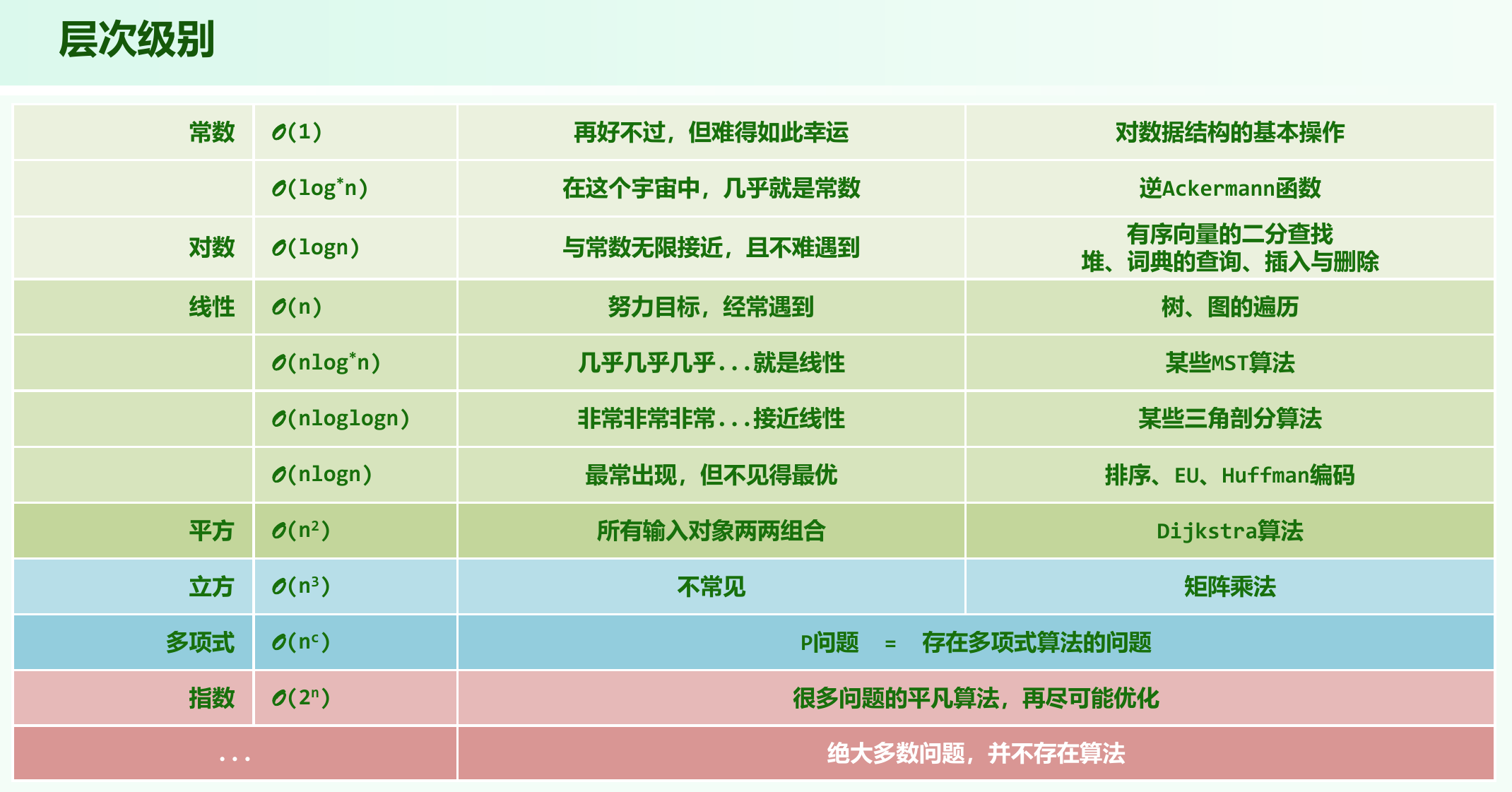 - O(nc) 多项式复杂度。其中 O(n) 为线性复杂度,很多编程习题主要覆盖 O(n) 到 O(n2) 范围,否则难度大大增加。